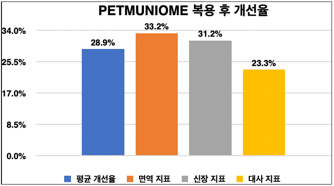 PETMUNIOME은 말기 암 개 4마리를 대상으로 한 3개월 임상에서 11개 바이오마커 평균 28.9% 개선을 입증한 면역 강화 제품입니다.